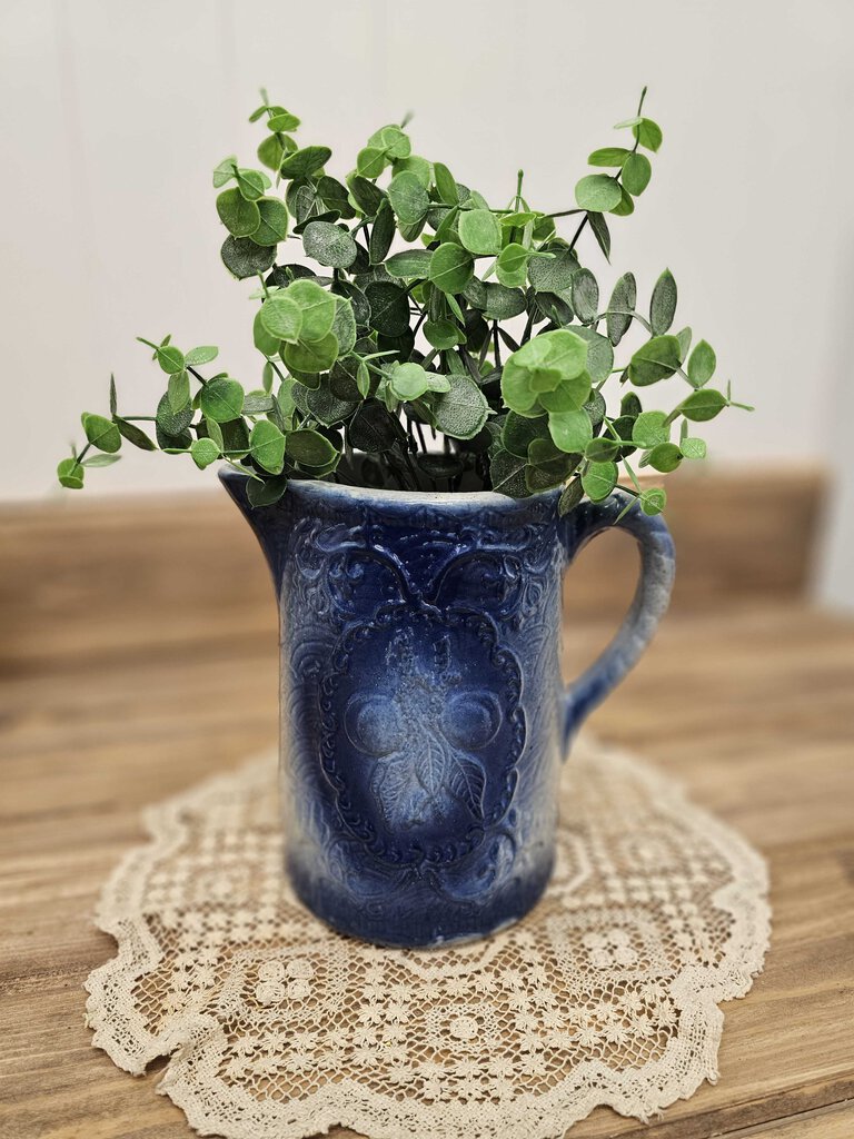 This pitcher measures approximately 8" tall, 9" deep including the handle, and 5 1/2" in diameter at the base.