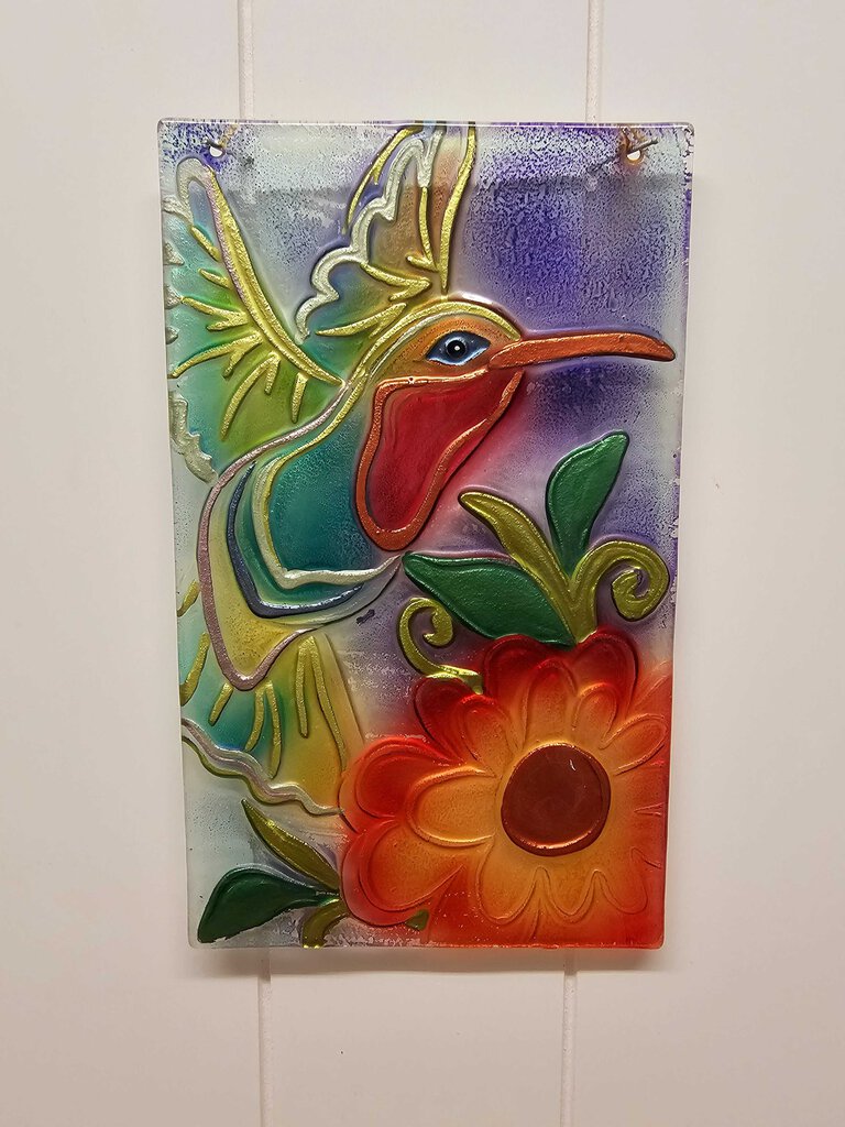 This gorgeous piece of glass wall art features a handpainted hummingbird and flower, with gorgeous reds, yellows, and greens. Hang this in your window, or add to your whimsy wall for a unique addition to your home decor!