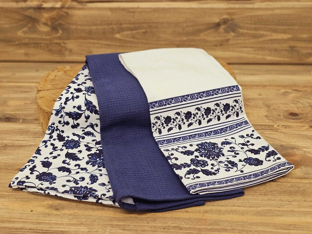 This gorgeous set of 3 tea towels would be a beautiful addition to your blue and white kitchen. One towel is a solid blue waffle texture. Each of the other two towels matches one side of the coordinating table runner.