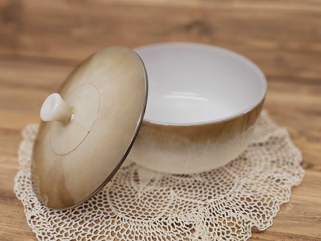 Federal Glass is primarily known for their glassware, they did make bakeware but it is not as common which makes this piece an exceptional find! It is the Mesa pattern in brown ombre with an irridescent finish. You will likely never see another one of these!