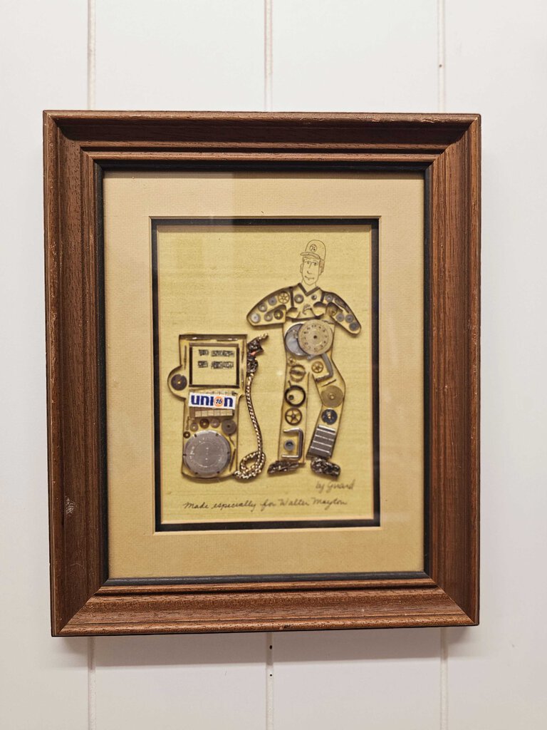 This amazingly unique piece of horological art is a signed piece by Girard, and has a handwritten inscription "Made especially for Walter Mayton". The art is handmade using clock and watch parts from around the world, and has been professionally matted and framed in a wood frame.