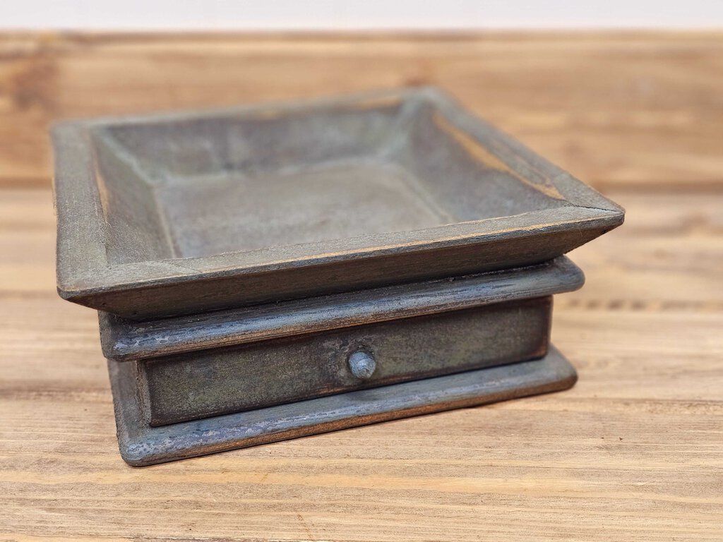 This uniquely shaped wood tray features a rustic green painted finish, and includes a small drawer for storing your bits and bobs.